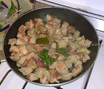 Tagliate a pezzi di media grandezza il guanciale, il cuore, il polmone e l’altra carne, mettete il tutto in padella con un pò d’olio e soffriggete a fuoco moderato per circa 15 minuti (se durante la cottura si forma dell’acqua, scolatela). Quando la carne sarà ben doratae asciutta, versate un bicchiere di brandy (o il vino bianco), quindi lasciate evaporare. Continuate la cottura aggiungendo ancora dell’olio, il peperoncino e l’alloro, salate e lasciate soffriggere, sempre a fuoco moderato, per circa 15-20 minuti. A questo punto aggiungete la cipolla tagliata grossolanamente, fatela dorare,e completate la cottura.