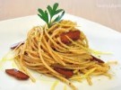 Fate cuocere gli spaghetti in abbondante acqua salata. Intanto mettete dell’olio in una padella e fatelo scaldare. A cottura ultimata scolate gli spaghetti, rimettete la padella con l’olio sul fuoco e versateci dentro la pasta, grattugiate sopra una parte della bottarga, aggiungete del pepe nero e qualche mestolo d’acqua di cottura; mescolate, continuate alternando la mescita della pasta con la bottarga grattugiata e servite il piatto caldissimo.