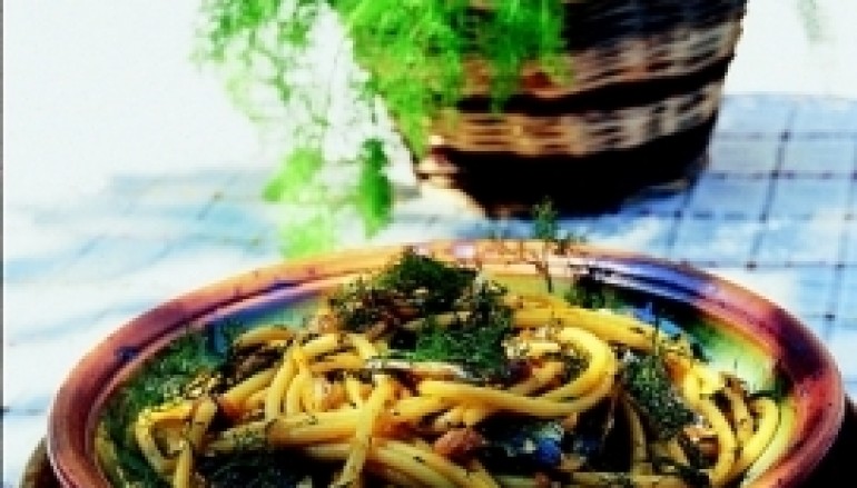 Lessate il finocchio selvatico in abbondante acqua salata e conservate l’acqua di cottura. In un tegame fate inbiondire la cipolla, tagliata a fettine sottili, in tre cucchiai d’olio, unite i filetti d’acciuga schiacciandoli con la forchetta. Aggiungete poi l’uvetta con i pinoli, un mestolo di acqua di cottura del finocchio e lo zafferano che farete sciogliere bene. Aggiungete ora le sarde private delle lische, il finocchietto tagliuzzato, due mestoli di acqua di cottura, sale, pepe e fate cuocere a fuoco lento per circa 10 minuti.