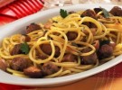 Sciacquate le sarde, tritatele finemente e amalgamatele in una terrina con metà prezzemolo, uno spicchio d’aglio e il cumino tritati, il tuorlo e un pizzico di pepe. Modellate con le mani tante polpettine, immergetele nell’uovo restante sbattuto, passatele nel pangrattato ricoprendole completamente e friggetele nell’olio d’oliva. Scolate su carta da cucina e salate. Pulite i funghi raschiandoli delicatamente e passandoli con carta da cucina inumidita, tagliateli a cubetti e metteteli in un tegame con l’olio, l’aglio e le foglie di prezzemolo rimaste tritati, bagnate con il vino, salate, pepate e fate cuocere per 15 minuti. Aggiungete le polpettine di sarde e fatele insaporire per un paio di minuti nel sugo. Lessate gli spaghetti molto al dente, in abbondante acqua salata, scolateli, trasferiteli nel tegame con i funghi, saltateli e serviteli subito.
