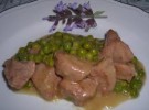 Tagliate il vitello a fettine piccolissime, infarinatele e fatele rosolare a fuoco vivo nel burro. Bagnate col Marsala ed il brodo, aggiungete i piselli, cotti a parte, salate, e fate cuocere a fuoco vivo per qualche minuto in modo che la salsina si addensi bene.