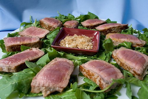 Prendete una pentola e riscaldate a fuoco alto dell’olio, poi cuocete la carne su entrambi i lati per almeno tre minuti da renderla al sangue. Mettete sul piatto di portata la rucola, iniziate a preparare il condimento amalgamando sei cucchiai di olio, due di senape e il limone. Non appena la carne è pronta, la tagliate a fette e le sistemate sulla rucola, alla fine aggiungete la salsa appena preparata.