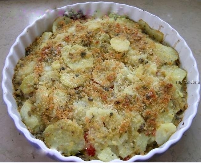 Private i carciofi delle foglie dure, del gambo e dell’eventuale fieno centrale; divideteli in spicchi e immergeteli in acqua e limone. Lessateli per qualche minuto in acqua salata e scolateli. Sbucciate le patate e tagliatele a fette rotonde, quindi lessatele fino a metà cottura e scolatele. Ungete una teglia con dell’olio e spolverizzatela con del pangrattato. Cominciate a disporre sul fondo uno strato di carciofi e uno di patate, poi condite con il salame e la provola, origano, sale e pecorino misto al pangrattato. Ripetete alternando i carciofi e il condimento fino ad esaurimento degli ingredienti, quindi distribuite sull’ultimo strato il pangrattato, irrorate con un filo d’olio e cuocete in forno preriscaldato a 200° per 30 minuti circa, fin quando la superficie sarà ben dorata.