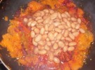Mettete dell’olio in un tegame, aggiungete uno spicchio d’aglio schiacciato, fatelo soffriggere e aggiungete le fette di zucca. Aggiustate di sale e fatele cuocere schiacciandole con una forchetta fino a quando non saranno disfatte. Aggiungete i fagioli con parte del loro liquido di cottura, un pò di finocchio selvatico, del peperoncino macinato. Mescolate, fate insaporire per qualche minuto e servite.