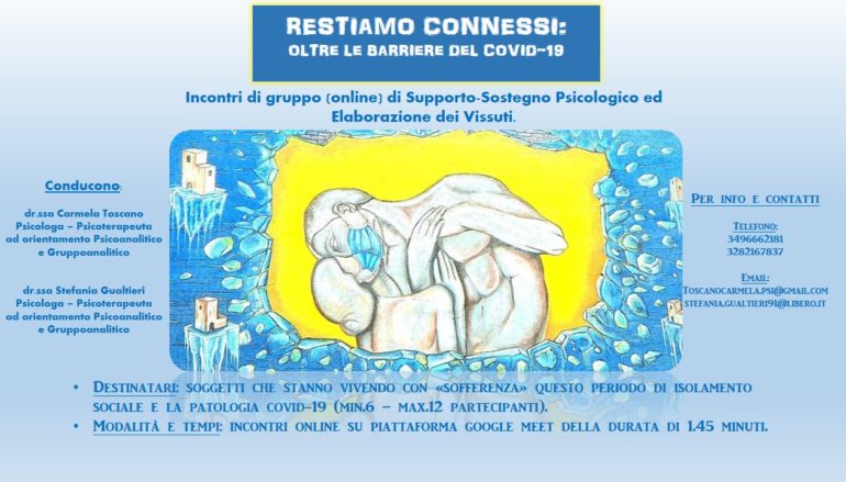 E’ proprio dall’analisi dei bisogni sociali odierni che nasce l’idea di due psicologhe – psicoterapeute, la Dott.ssa Carmela Toscano e la Dott.ssa Stefania Gualtieri: proporre dei gruppi on line per poter fornire, a chi interessato, uno “spazio” protetto e monitorato e condotto in maniera professionale che possa permettere di “superare” ed affrontare questo difficile momento di vita, di condivisione mondiale.