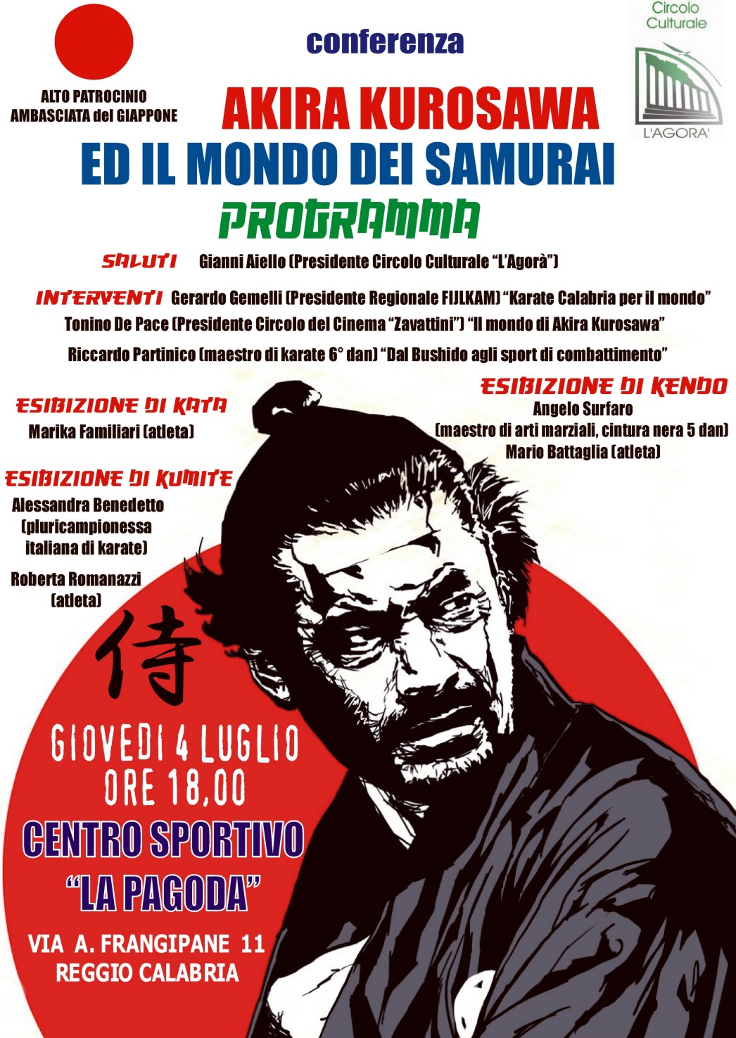 Con l’Alto Patrocinio dell’Ambasciata del Giappone, il Circolo Culturale “L’Agorà” organizza per giovedì 4 luglio un incontro avente come tema “Akira Kurosawa ed il mondo dei samurai”. Alla conferenza, dopo i saluti del presidente del sodalizio organizzatore Gianni Aiello, seguiranno gli interventi di Tonino De Pace (presidente del Circolo del Cinema “Zavattini” di Reggio Calabria su “Il mondo di Akira Kurosawa”, Riccardo Partinico (maestro di Karate 5° dan) su “Dal Bushido agli sport di combattimento” e Gerardo Gemelli (Presidente Regionale FIJLKAM) su “Karate Calabria nel mondo”.