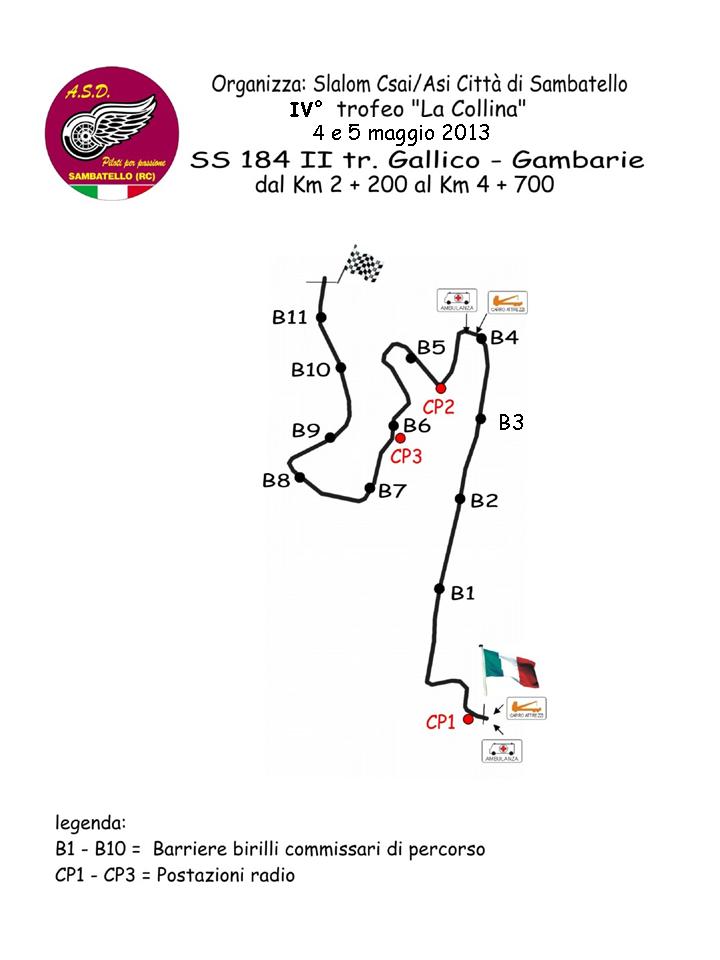 Riprende l’attività motoristica nel reggino e continua senza sosta l’attività delle società affiliate all’ASI – Associazioni Sportive Sociali Italiane (ex Alleanza Sportiva Italiana), Domenica 5 Maggio 2013 con inizio alle ore 9.00 si disputerà il 4° Trofeo “La Collina” Città di Sambatello, gara automobilistica di Slalom ASI CSAI che vedrà impegnati i migliori piloti meridionali sul’impegnativo e panoramico percorso Gallico – Sambatello (naturale balcone sullo Stretto).