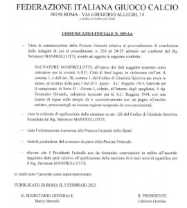 − Vista la comunicazione della Procura Federale relativa al provvedimento di conclusione delle indagini di cui al procedimento n. 234 pf 24-25 adottato nei confronti del Sig. Salvatore MANFRELLOTTI, avente ad oggetto la seguente condotta: