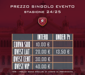 Sul territorio di Reggio Calabria, sarà possibile acquistare il tagliando d’accesso allo stadio presso il punto vendita autorizzato BCenters, sito in Via Sbarre Centrali, 260/b | aperto tutti i giorni dalle ore 9:00 alle ore 20:00 (orario no stop).