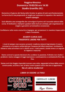 Profumo di derby. La Curva Sud ,si prepara a sostenere la Reggina nella sfida con il Messina al Granillo. Gli ultras amaranto, hanno annunciato con un messaggio che sarà allestita una coreografia che coinvolgerà il primo ed il secondo settore della curva, esprimendo solidarietà per l’assenza dei tifosi messinesi per la trasferta loro vietata e nel contempo sottolineano come la decisione “svilisca l’essenza stessa dello sport”. La Sud, nel promuoveremo il rispetto e la correttezza, ha invitato tutti a “evitare cori o sfottò verso i rivali assenti”.