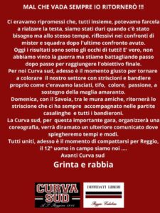 Lo scontro diretto tra le mura amiche con il Savoia sarà uno snodo importante per la squadra dello Stretto a -2 dalla vetta del girone I di serie D. Gli ultras della “Sud” sempre il “dodicesimo uomo in campo”, anche per il delicato big match del “Granillo” con i Campani, sono pronti a riempire in massa la curva dando alla squadra con il loro caldo incitamento unito ad una coreografia di bandiere e striscioni, quella spinta che certamente sarà decisiva. In vista dell’importante appuntamento, gli ultras hanno voluto così rivolgere il loro sentito appello a tutti i tifosi della Reggina: