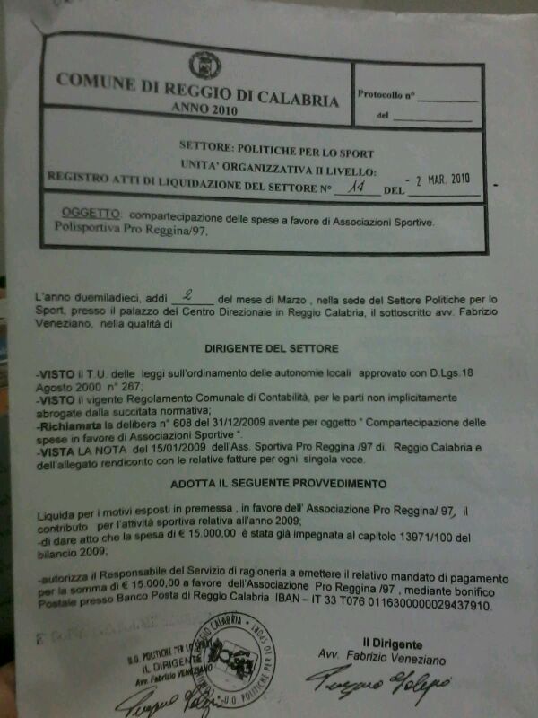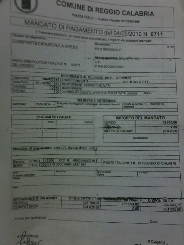 Nell’anno 2009 il Comune di Rc attestava la corresponsione, a favore della Pro Reggina 97, di una somma ammontante a Euro 15.000.00 a titolo di contributo per l’attività sportiva. Detta somma veniva poi impegnata al capitolo 13971/100 del bilancio 2009. In data 04/05/2010 veniva emesso il mandato di pagamento n°6711 mediante il quale il Tesoriere del Comune di Rc avrebbe dovuto liquidare alla Società Pro Reggina 97 la suddetta somma di Euro 15.000.00.