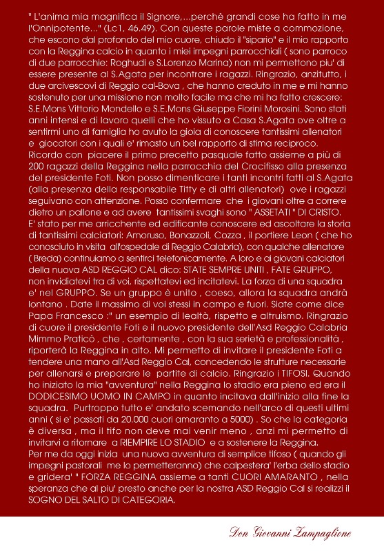 Il parroco invita Foti ad avvicinarsi all’ASD Reggio Calabria e ricorda con affetto tutte le persone incontrate al Sant’Agata.