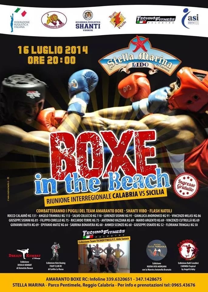 La serata promossa ancora una volta dai promoter Carmelo Regolo – Presentatore e Promoter Eventi Sportivi e Leone D’Andrea è organizzata dall’Amaranto Amaranto Boxe – Shanti Vibo – Team Boxe Alfredo “Flash” Natoli in collaborazione con il Lido Stella Marina.