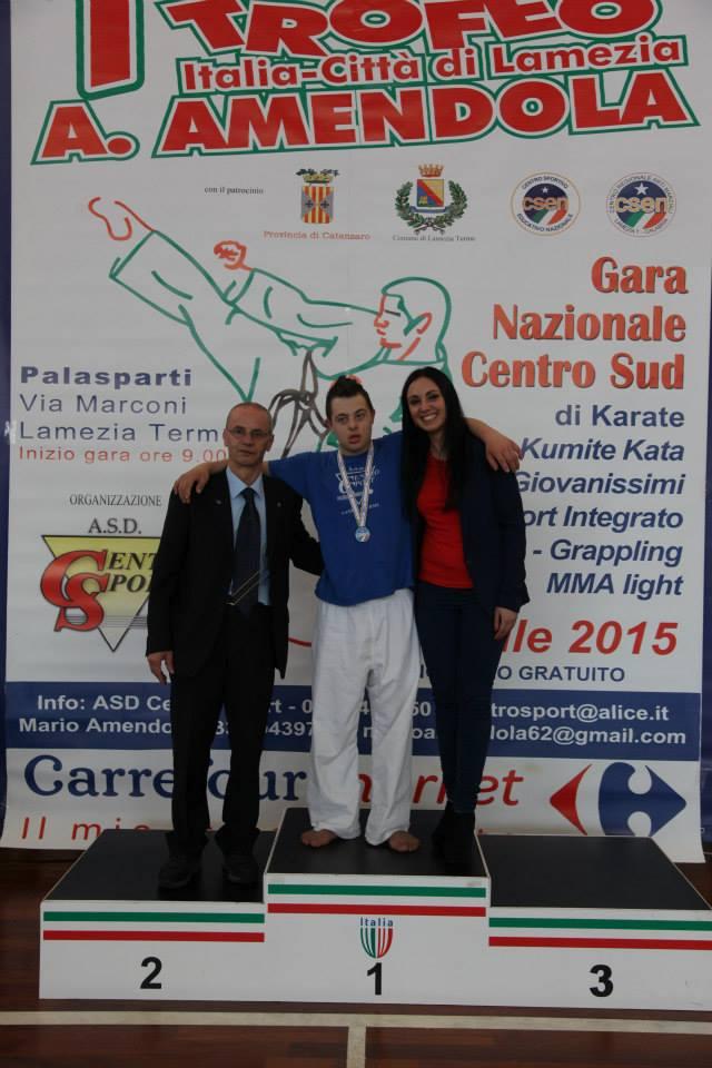 Organizzata dal Centro Sport di Lamezia Terme in collaborazione con il centro regionale arti marziali e sport da combattimento CSEN Calabria, si è svolta sabato 25 aprile 2015 presso il Palazzetto dello Sport “Palasparti” di Lamezia Terme la 7° edizione del “Trofeo Antonio Amendola Italia- Città di Lamezia Terme, gara nazionale centro sud di KARATE KUMITE, KATA, GRAN PREMIO GIOVANISSIMI SPORT INTEGRATO, KICK BOXING, GRAPPLING, MMA LIGHT. L’atteso evento sportivo ha visto l’esibizione di oltre 300 atleti provenienti dal Sud Italia. Tante la autorità presenti alla manifestazione sportiva in particolare il dottor Vittorio Paola, vice Presidente della Provincia di Catanzaro, il dottor Francesco Ruberto, assessore allo sport Provincia di Catanzaro, l’avvocato Rosario Piccioni, assessore allo sport Citta’ di Lamezia Terme, l’ingegnere Nicola Mazzocca, il maestro Sergio Servidone, Presidente della Consulta dello sport Citta’ di Lamezia Terme, il maestro Luigi Papaleo, presidente del comitato provinciale csen vibo che ha portato i saluti del presidente nazionale CSEN Francesco Proietti, il maestro Dino Gagliardi, presidente del comitato provinciale CSEN Cosenza e il maestro Max Cimino, responsabile sport da combattimento CSEN.
