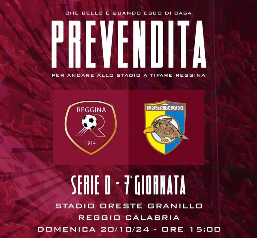 AS Reggina 1914 comunica che a partire dalle ore 14 di giovedì 17 ottobre, sarà attiva la vendita per l’acquisto del tagliando d’ingresso relativo la gara Reggina-Licata, in programma domenica 20 ottobre alle ore 15 allo stadio “Oreste Granillo” e valevole per la 7ª giornata del campionato di Serie D girone I.