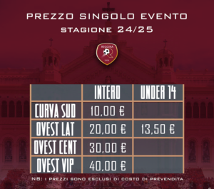 - Biglietto unico al costo di € 10 più prevendita. Non sarà possibile acquistare il tagliando allo stadio il giorno della gara.