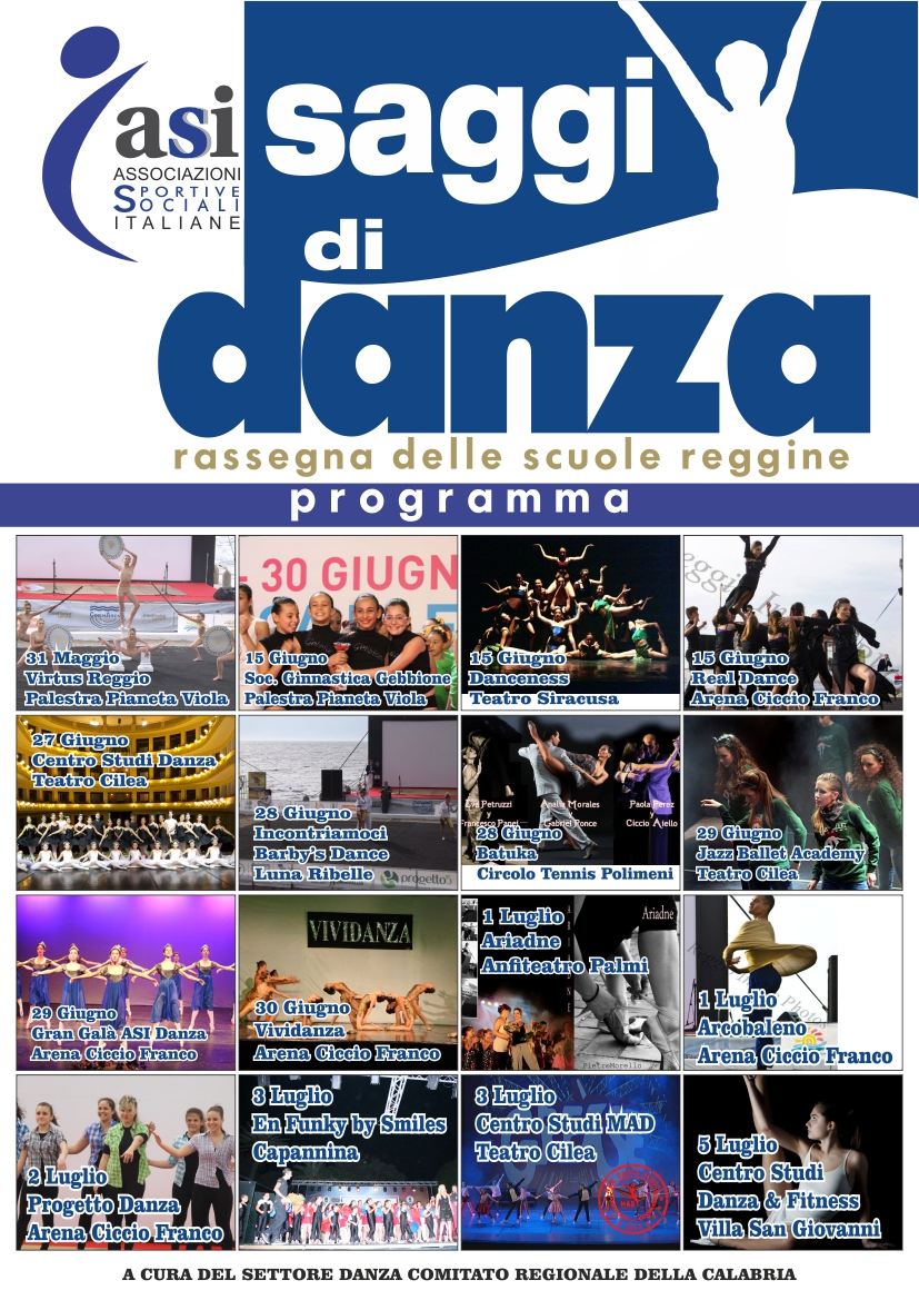 Mentre altre attività, come nel caso delle Scuole di Danza sono protese ad effettuare i saggi di fine anno ed a tirare le somme di uno splendido anno che ha visto i numerosi allievi ed allieve impeganrsi per apprendere le nozioni basilari e/o avanzate per distinguersi in una disciplina sportiva sempre più seguita ed apprezzata. Già iniziati i saggi di danza delle scuole affiliate al comitato provinciale ASI di Reggio Calabria (Locandina allegata), dal 30 giugno al 2 luglio saranno impegnate in saggi organizzati direttamente dal comitato Provinciale di Reggio) nell’ordine, le scuole di danza Vividanza, Arcobaleno e Progetto Danza.