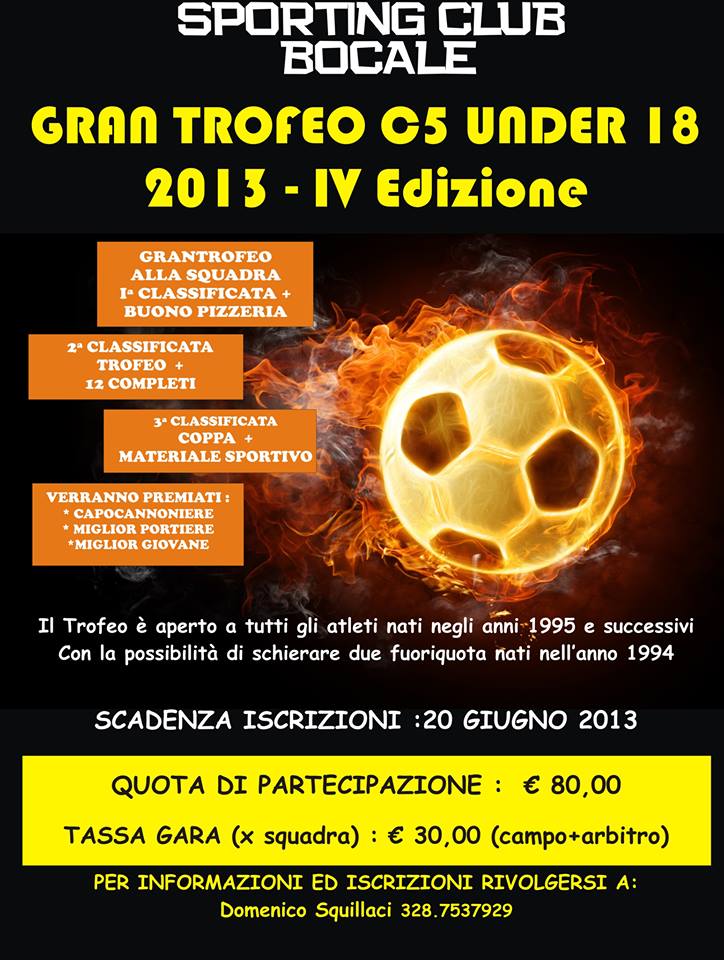 Aperte le iscrizioni per la IV edizione del “Gran Trofeo C5 Under 18 2013”. Il Trofeo è aperto a tutti gli atleti nati negli anni 1995 e successivi con la possibilità di schierare due fuoriquota nati nell’ anno 1994. La quota di partecipazione ammonta a 80€ a cui si devono aggiungere 30€ per ogni gara (per il pagamento dell’impianto sportivo e per il pagamento dell’arbitro).