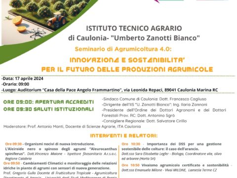 Seminario tecnico informativo sull’Agrumicoltura 4.0: “Innovazione e Sostenibilità per il Futuro delle Produzioni Agrumicole” a Caulonia, in provincia di Reggio…